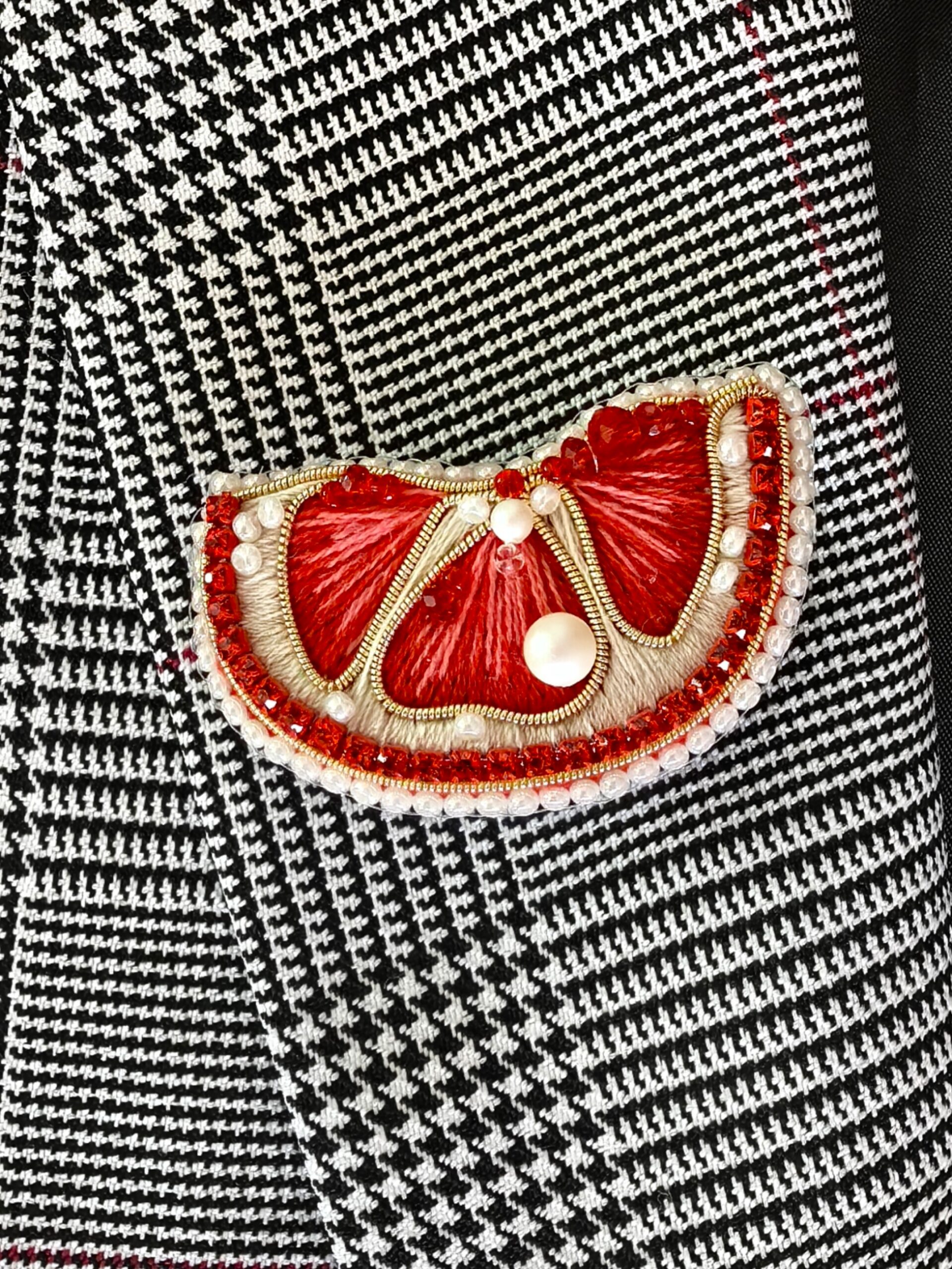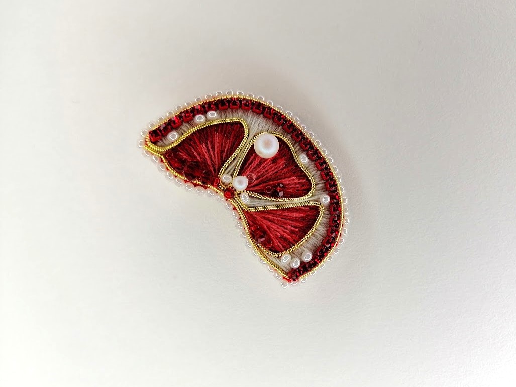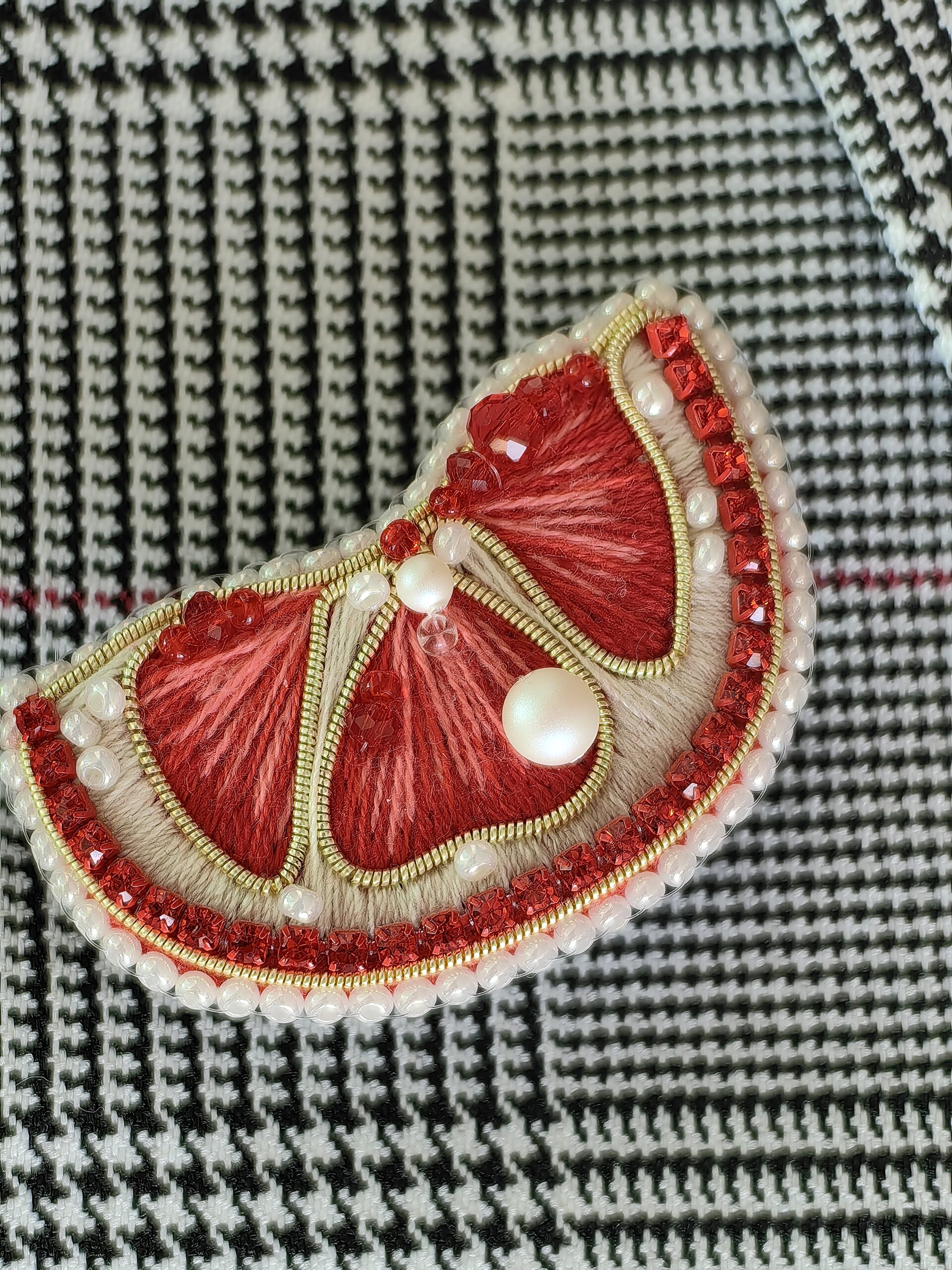 Женская брошь ручной работы “Грейпфрут” выполнена из жемчуга (Чехия, Япония), кристаллов Swarovski, цепочек со стразами, фетра, ниток, металлизированных пружинных нитей, экокожи. Застёжка — из ювелирного металла (цвет не меняет).