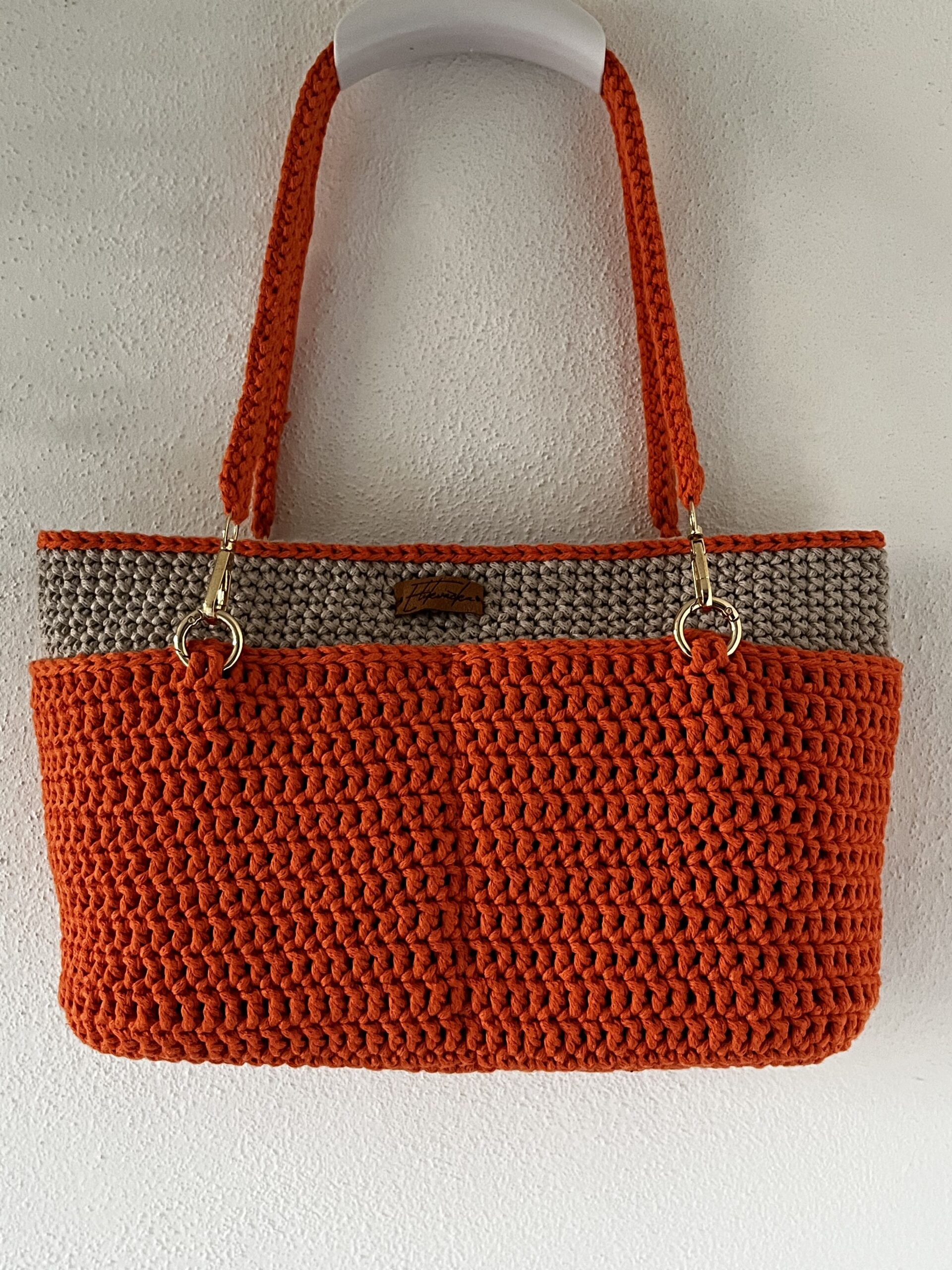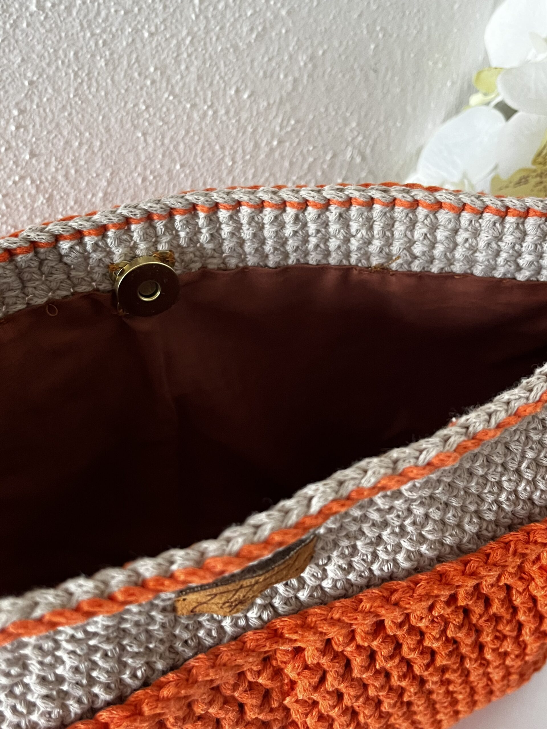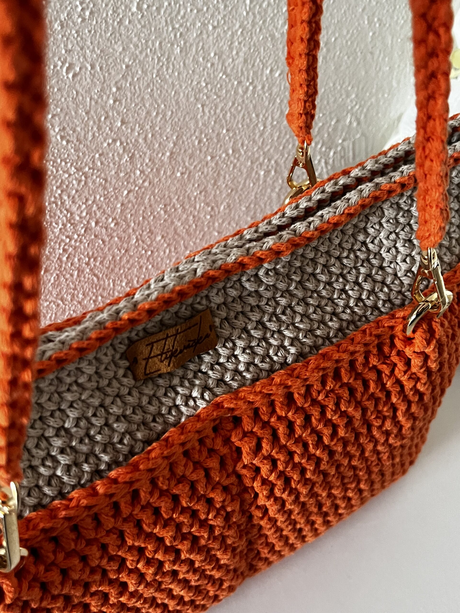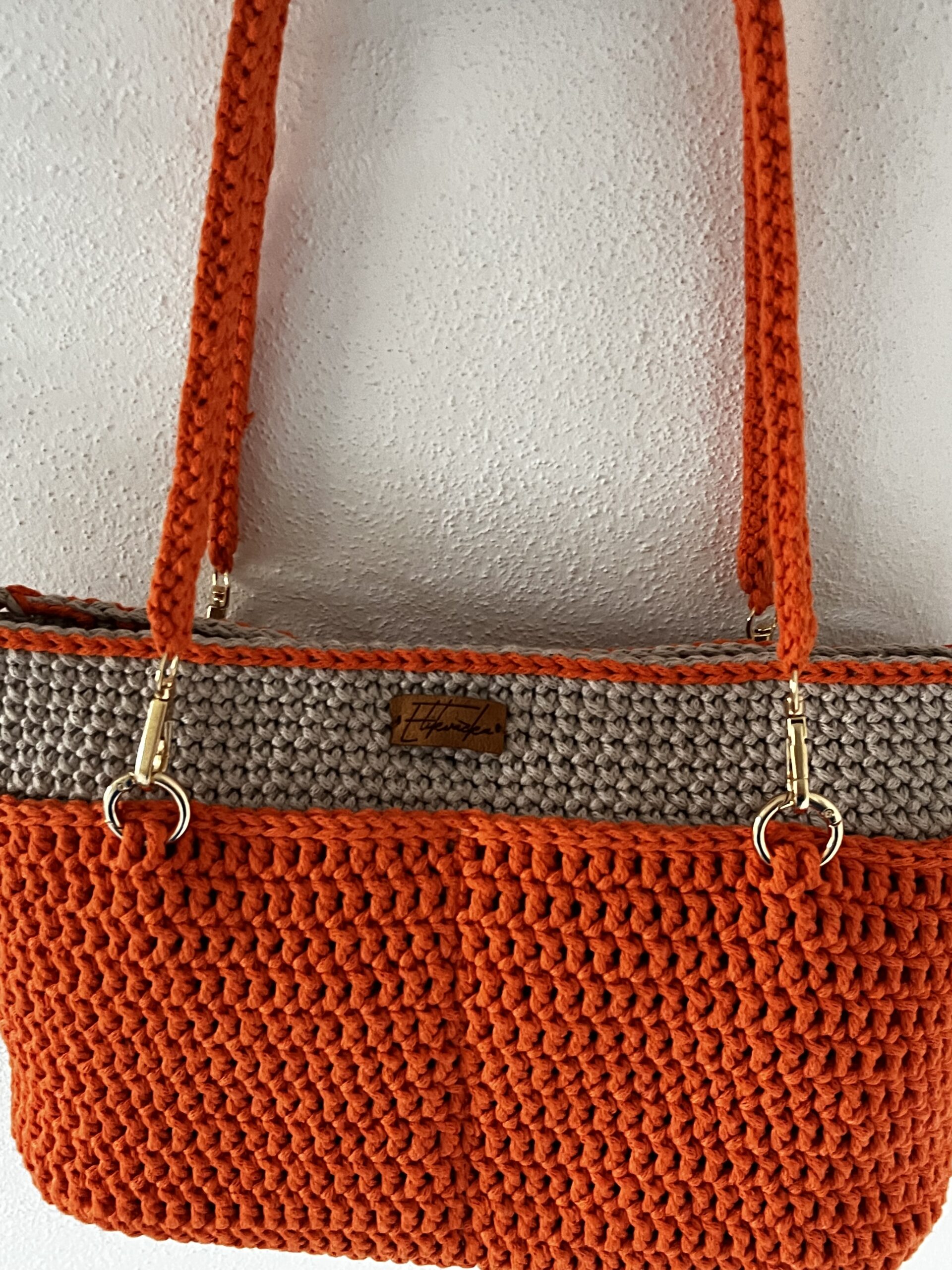 Ta ročno kvačkana lepotica v živahni oranžno-bež barvi je popolna za vsak dan – prostorna z več predalčki, bombažna in podložena🧶