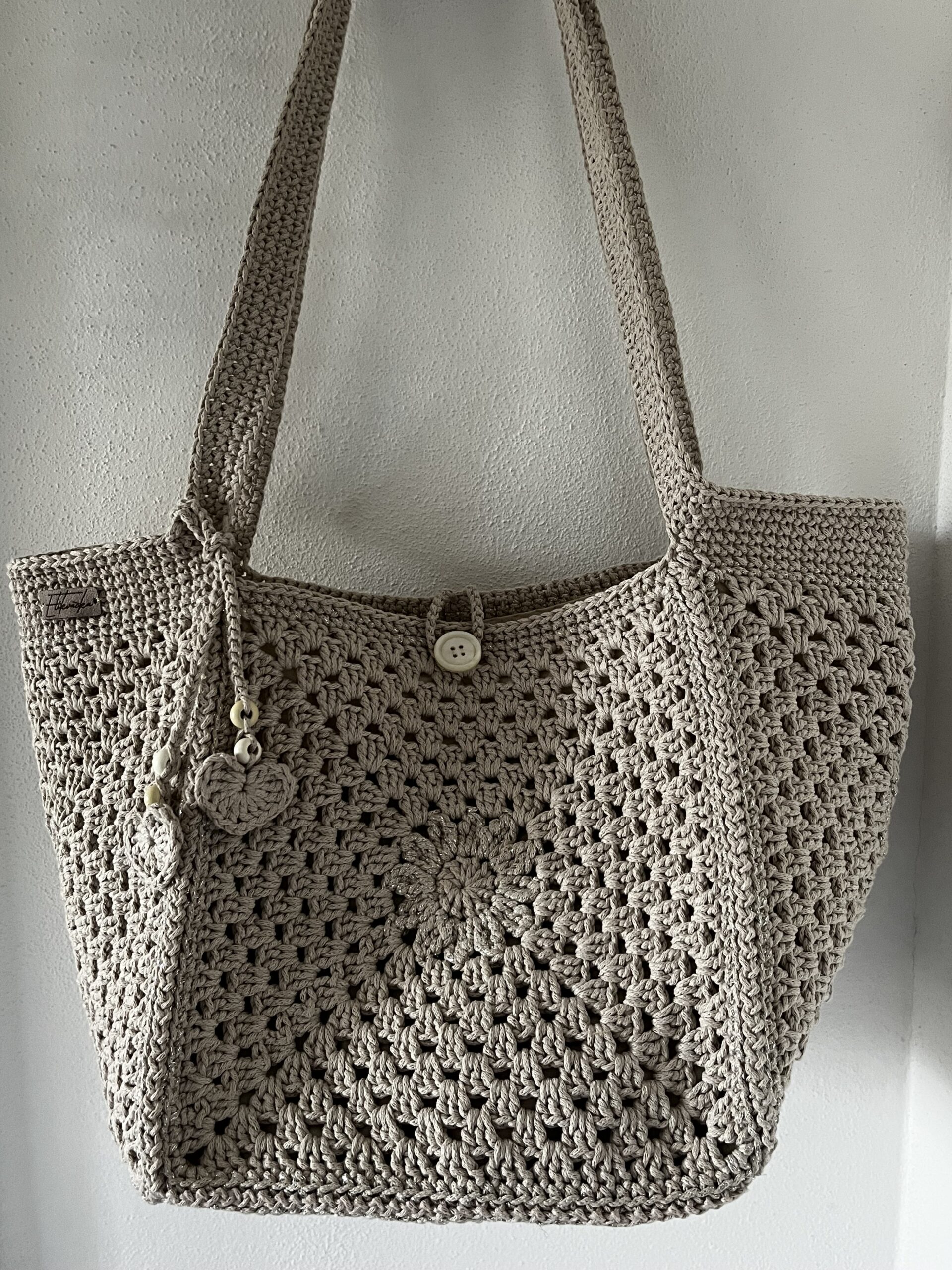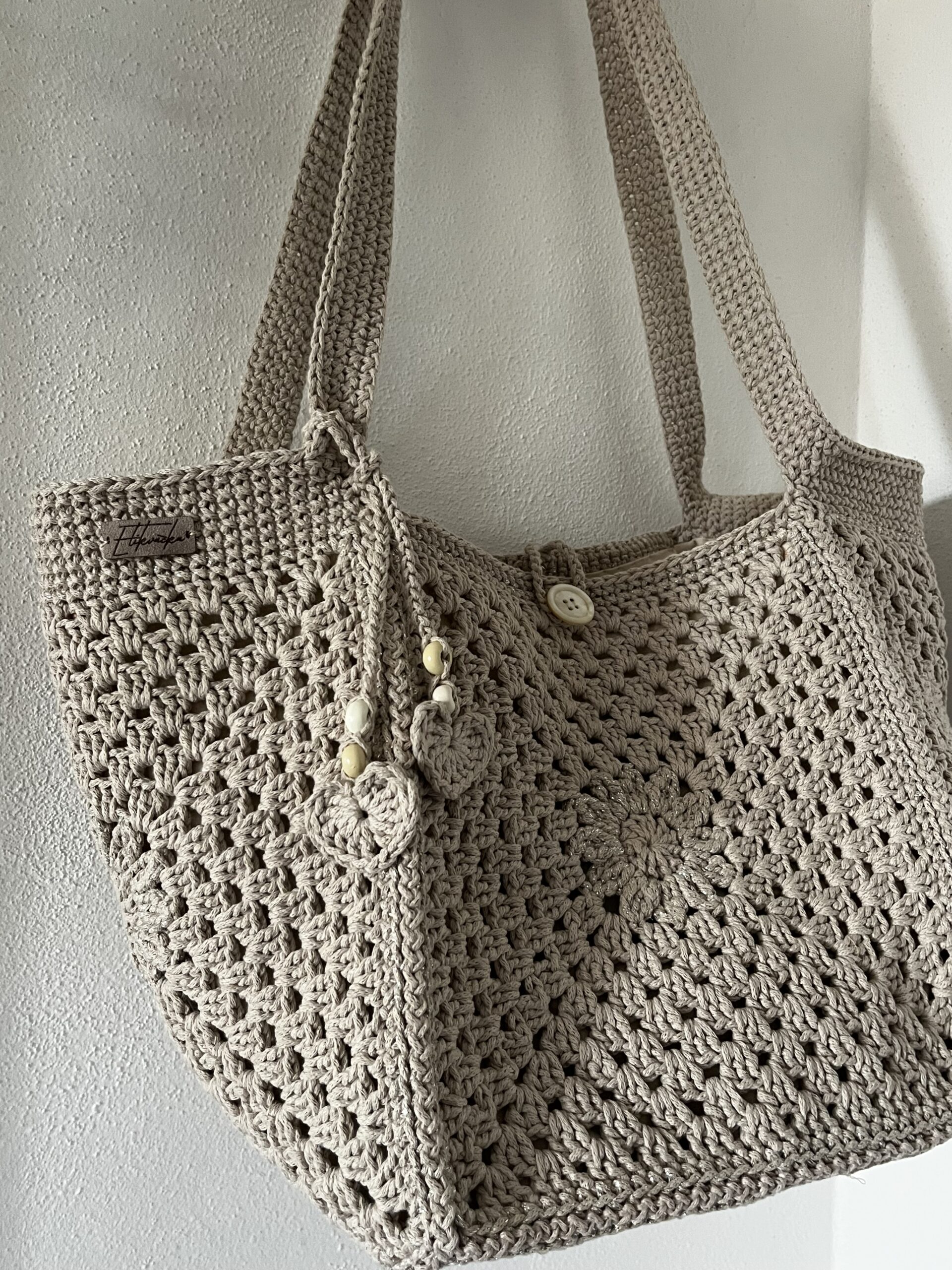 Kvačkana torba v bež barvi z dodatki