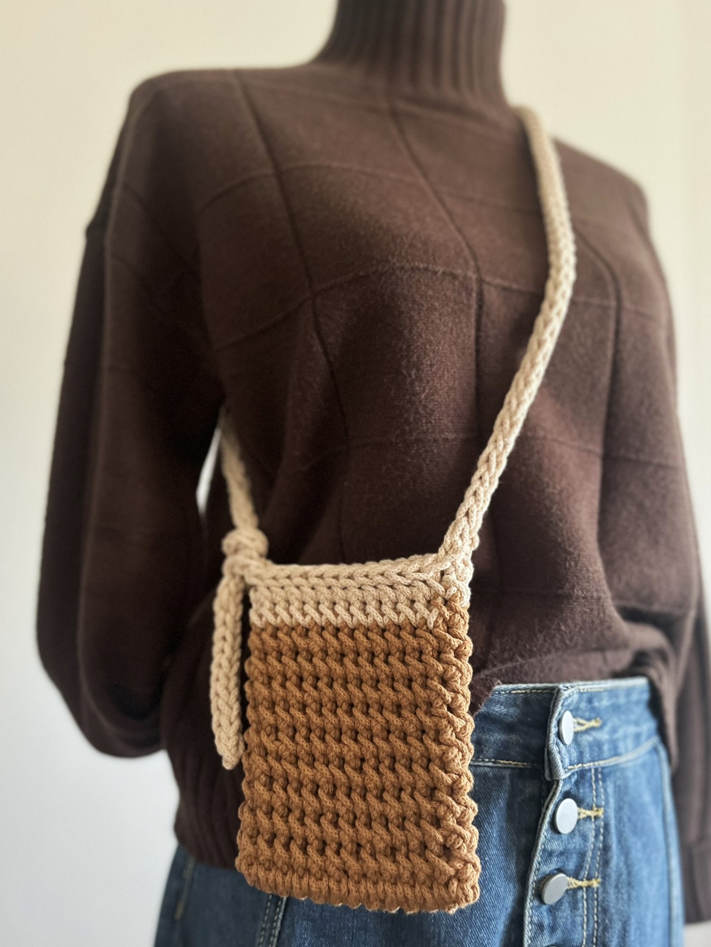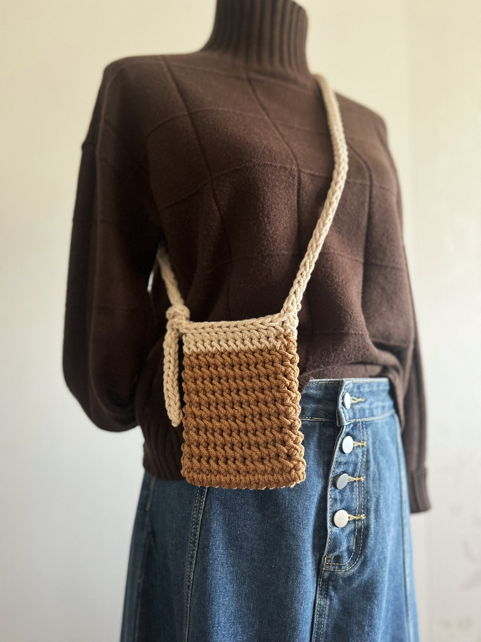 Kvačkana torbica Lina v čudoviti kombinaciji karamelne in bež barve združuje funkcionalnost in stil. Popolna za tiste trenutke, ko želiš imeti pri sebi le najnujnejše.
