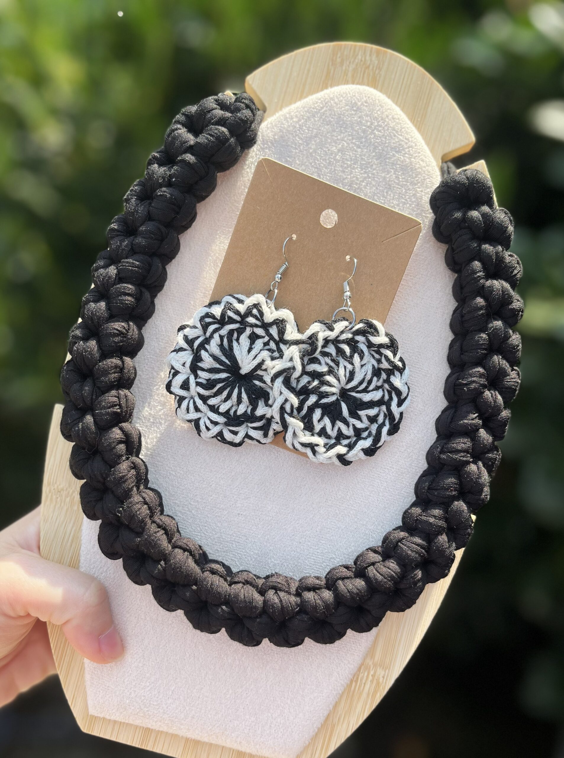 Ogrlica je ročno kvačkana iz mehke, kakovostne preje, ki se udobno prilega vratu in doda vsakemu outfitu pridih samozavesti in unikatnosti. Cvetlični uhani s črno-belo prepletajočo teksturo simbolizirajo ravnotežje med svetlobo in temo – popolna izbira za sodobno, pogumno žensko.