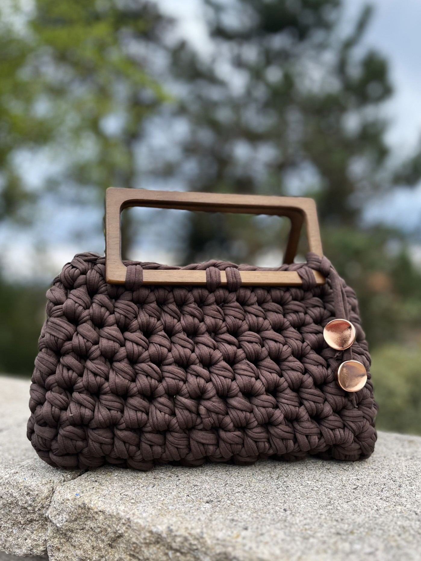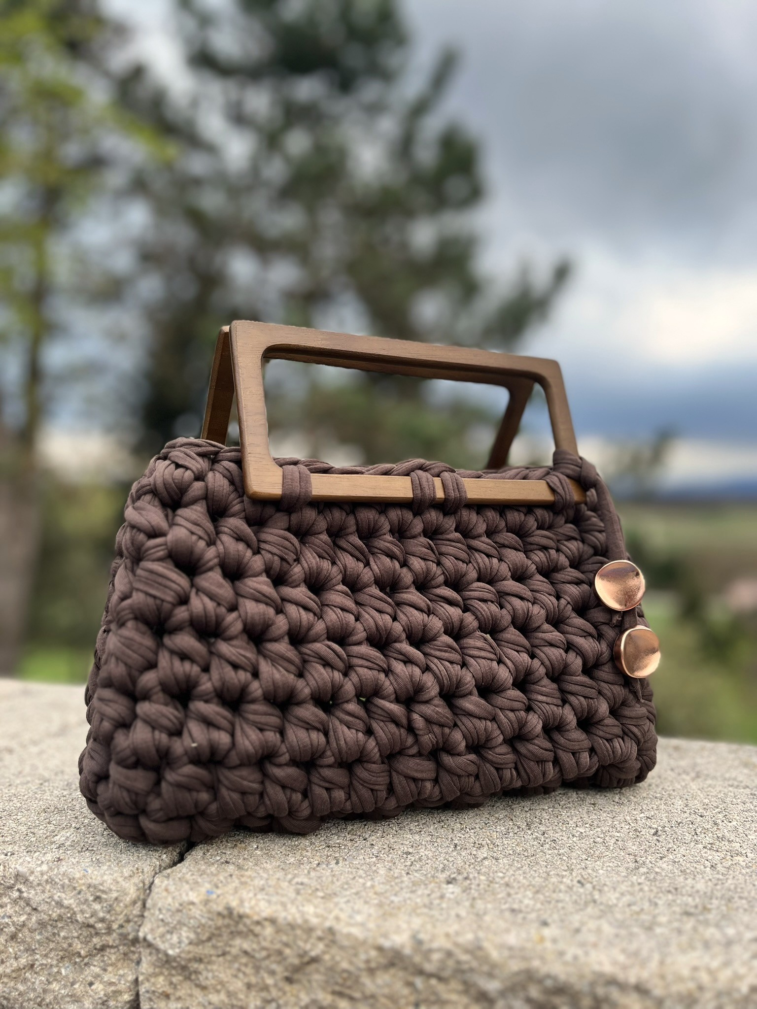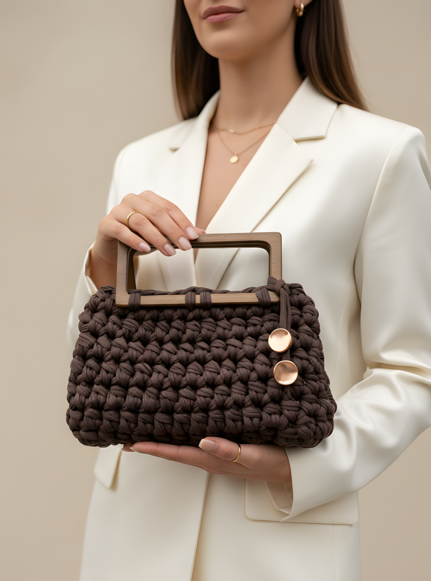 Noir Gold – kvačkana torbica je prefinjen ročno izdelan modni dodatek, ki združuje sodoben dizajn, naravne materiale in eleganco. Torbica je skrbno kvačkana iz kakovostne preje v bogatem temno rjavem odtenku, ki izžareva toplino, luksuz in brezčasno estetiko.