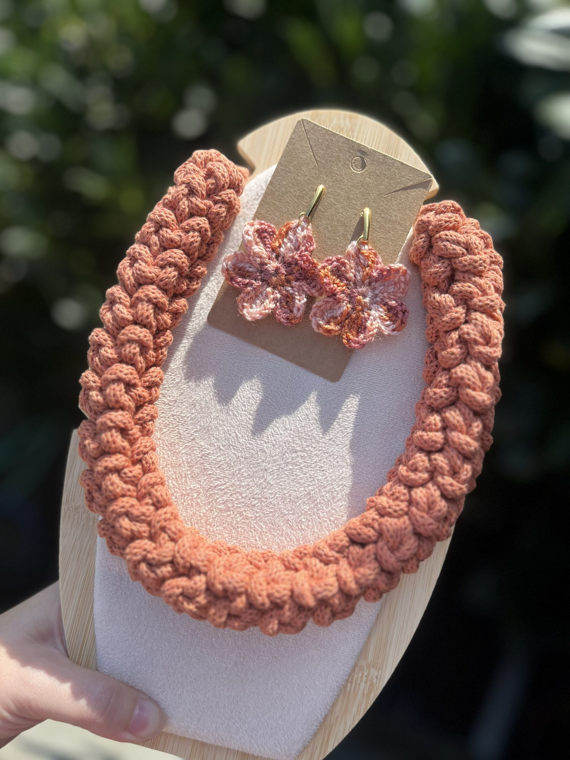 Ročno izdelan kvačkan komplet Rustic Blossom združuje toplino naravnih tonov in nežnost cvetličnih detajlov. Sestavljata ga debela pletena ogrlica v toplih opečnato-rjavih odtenkih in čudoviti cvetlični uhani, ki izžarevajo ženstvenost in eleganco.