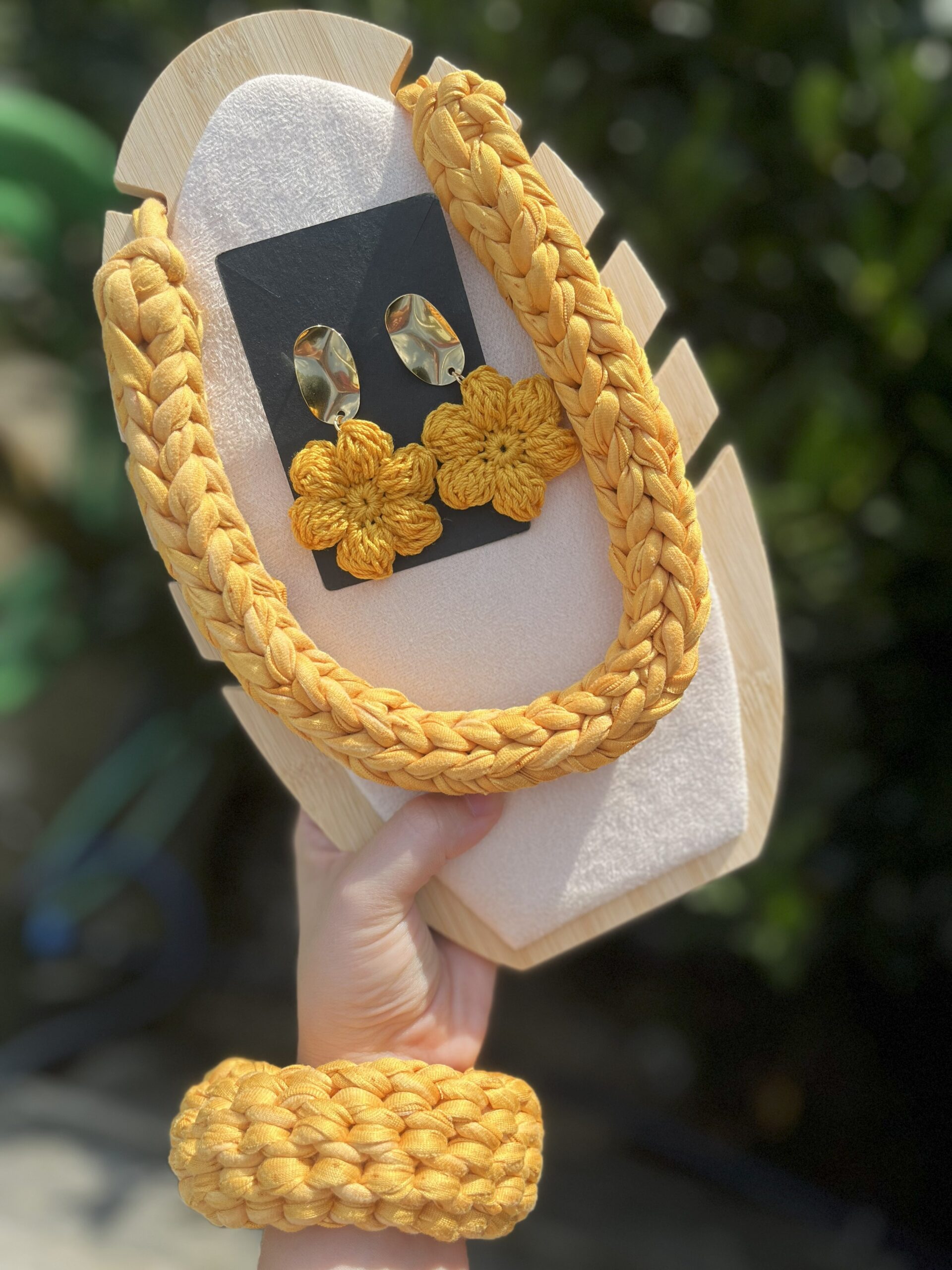 Sunshine – kvačkani komplet je živahen, drzen in poln pozitivne energije. V kompletu so verižica, cvetlični uhani z zlato kovinsko osnovo in široka kvačkana zapestnica, vse v sončno rumenem odtenku. Komplet je ročno izdelan z natančnostjo in strastjo do unikatnih dodatkov. Barva sonca prinaša toplino in optimizem, zato je ta komplet idealen za poletne dni, sproščene priložnosti ali kot izrazit modni kos ob posebnih dogodkih. Popolno darilo za osebo, ki obožuje živahne barve in ročno delo.