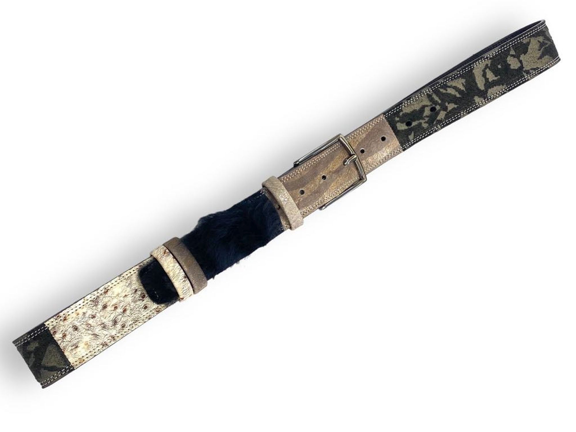 Usnjeni pas s pravim krznom v tehniki Patchwork, s kosi pravega usnja in krzna v harmonični kombinaciji črne in bakrene barve z nojevim vzorcem .