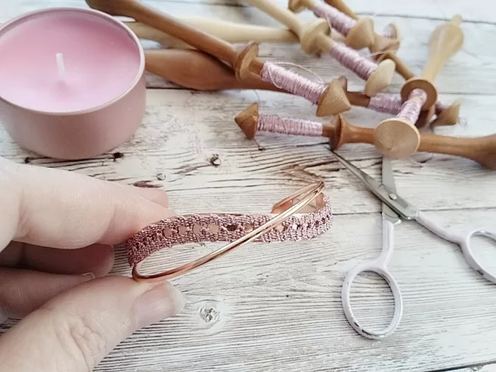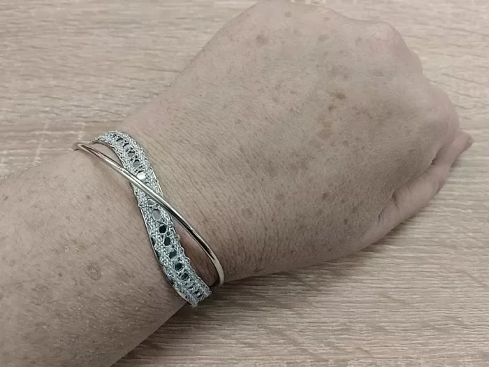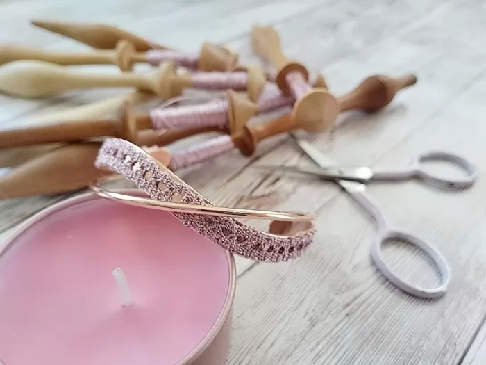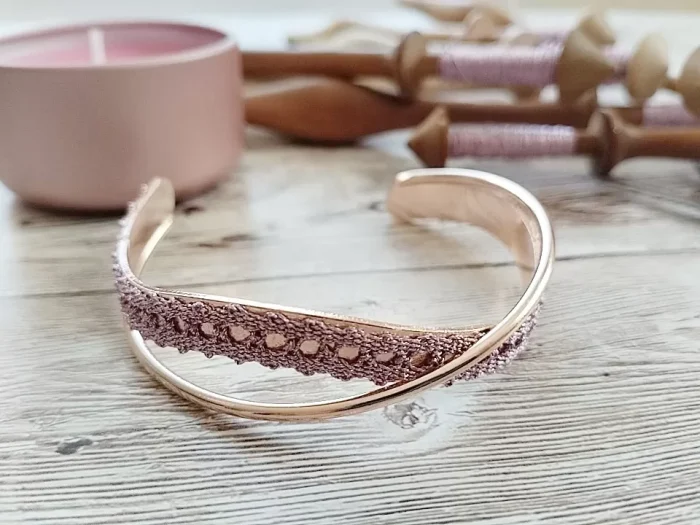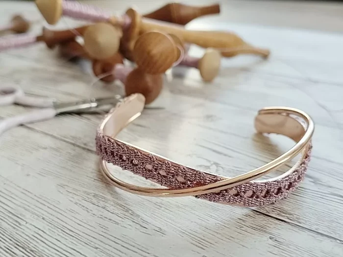 Kovinska zapestnica, ki jo krasi tradicionalna slovenska klekljana čipka, je čudovit modni dodatek.